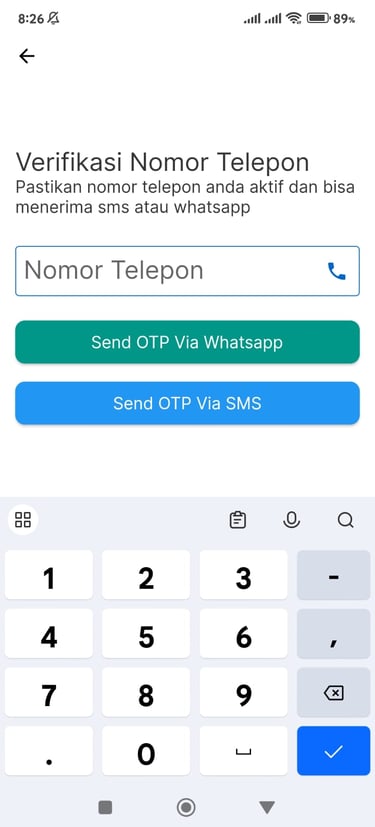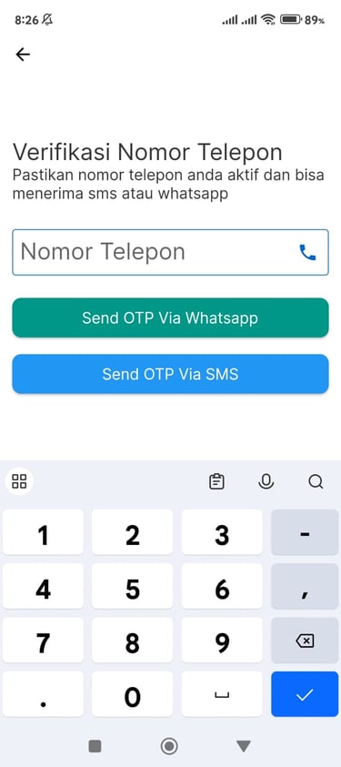 Masukkan nomor HP yang akan didaftarkan, kemudian pilih Send OTP Via Whatsapp